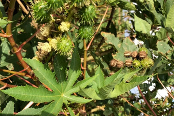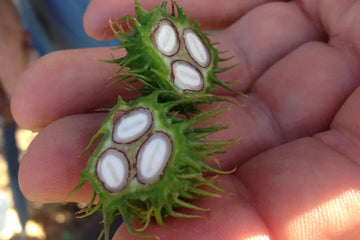 Carapate- oder „Schwarzes Rizinus“-Öl wird aus derselben Rizinusfrucht gewonnen, die an ihren Stacheln zu erkennen ist.