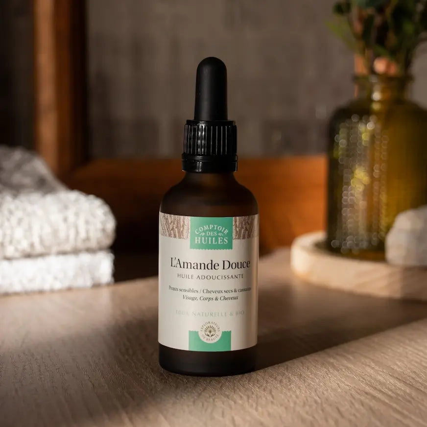 - Appliquez ensuite quelques gouttes d’huile d’amande douce sur le visage, le corps ou les cheveux pour apporter souplesse, nutrition et confort.