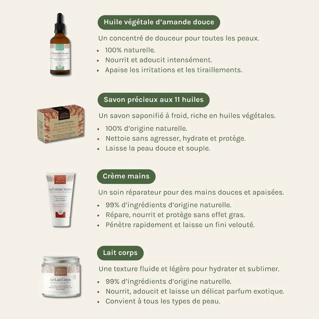 Contenance · Huile d’amande douce (50ml), Savon précieux (100g), Lait corps (100ml) & Crème mains (50ml)