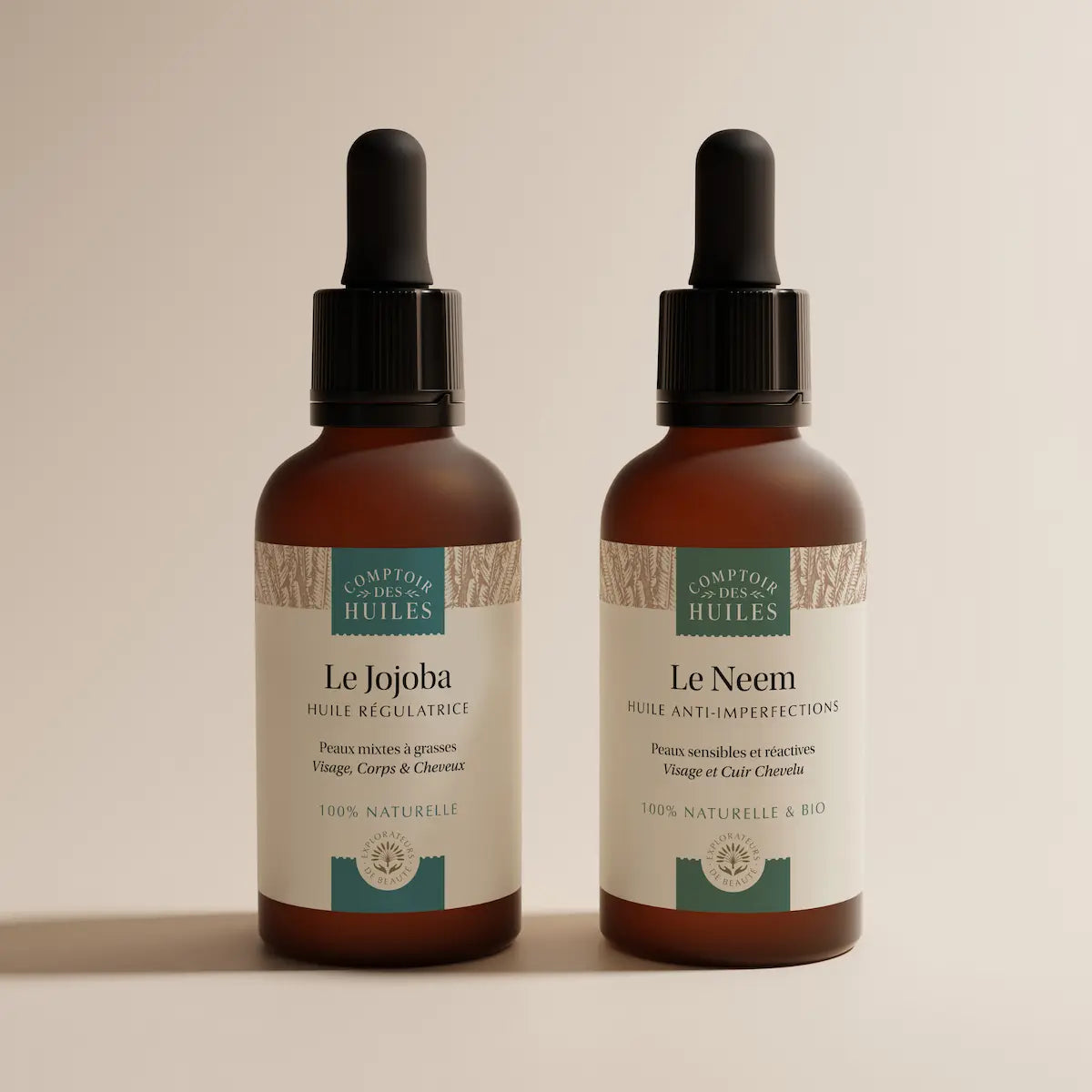 Das unverzichtbare Duo für Problemhaut. Jojobaöl zur Regulierung der Talgproduktion und Neemöl zur Reinigung von Unreinheiten.