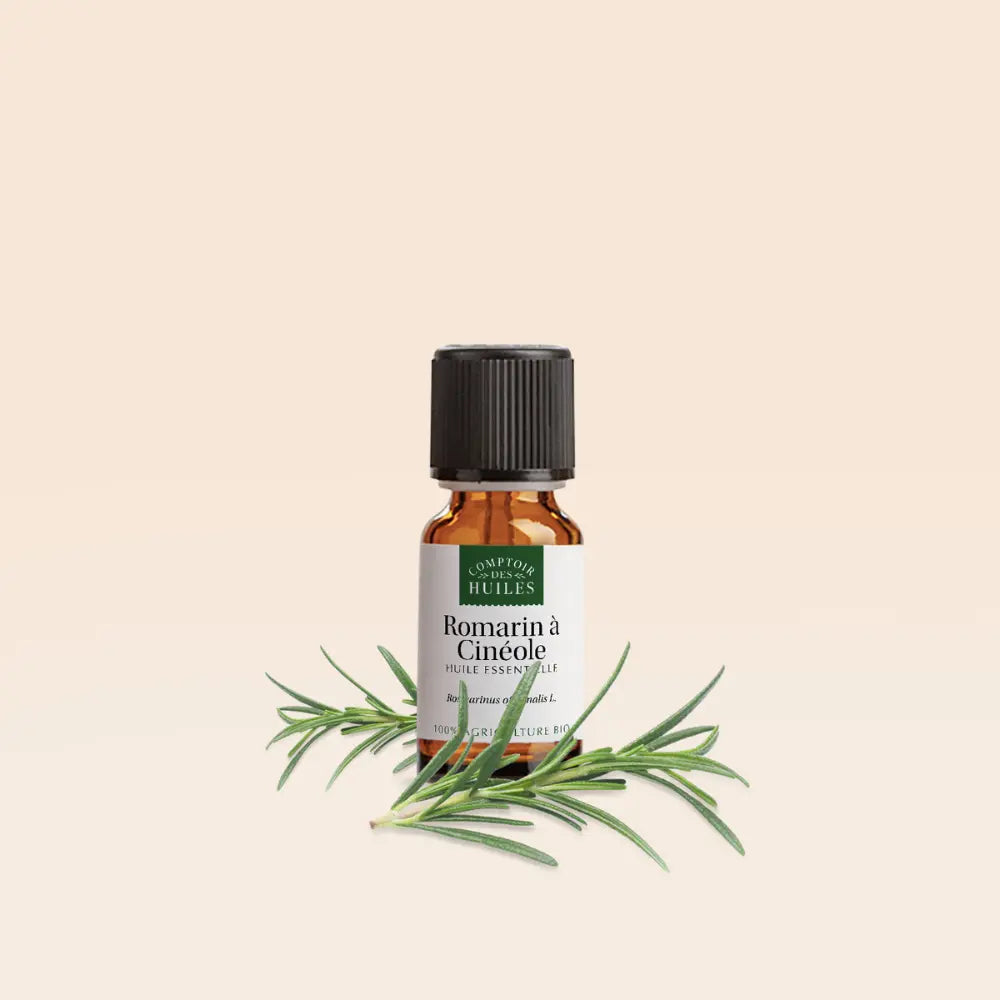 L’huile essentielle de romarin à cinéole, extraite par distillation à la vapeur des sommités fleuries de Rosmarinus officinalis, est reconnue pour ses propriétés purifiantes, tonifiantes et stimulantes.