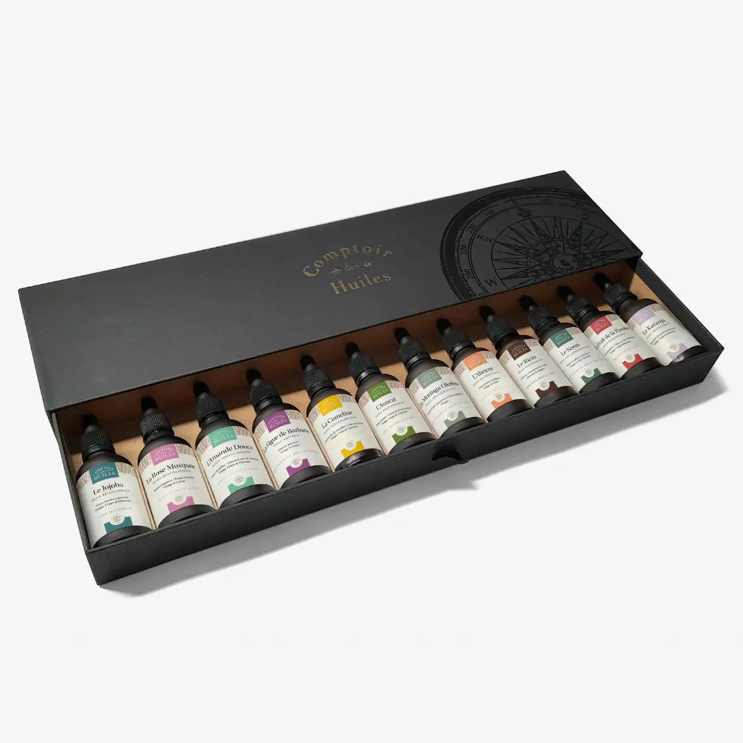 Découvrez l'Écrin Précieux, un coffret unique et raffiné qui regroupe une sélection de 12 huiles naturelles aux bienfaits multiples pour chouchouter votre peau et sublimer votre routine beauté.