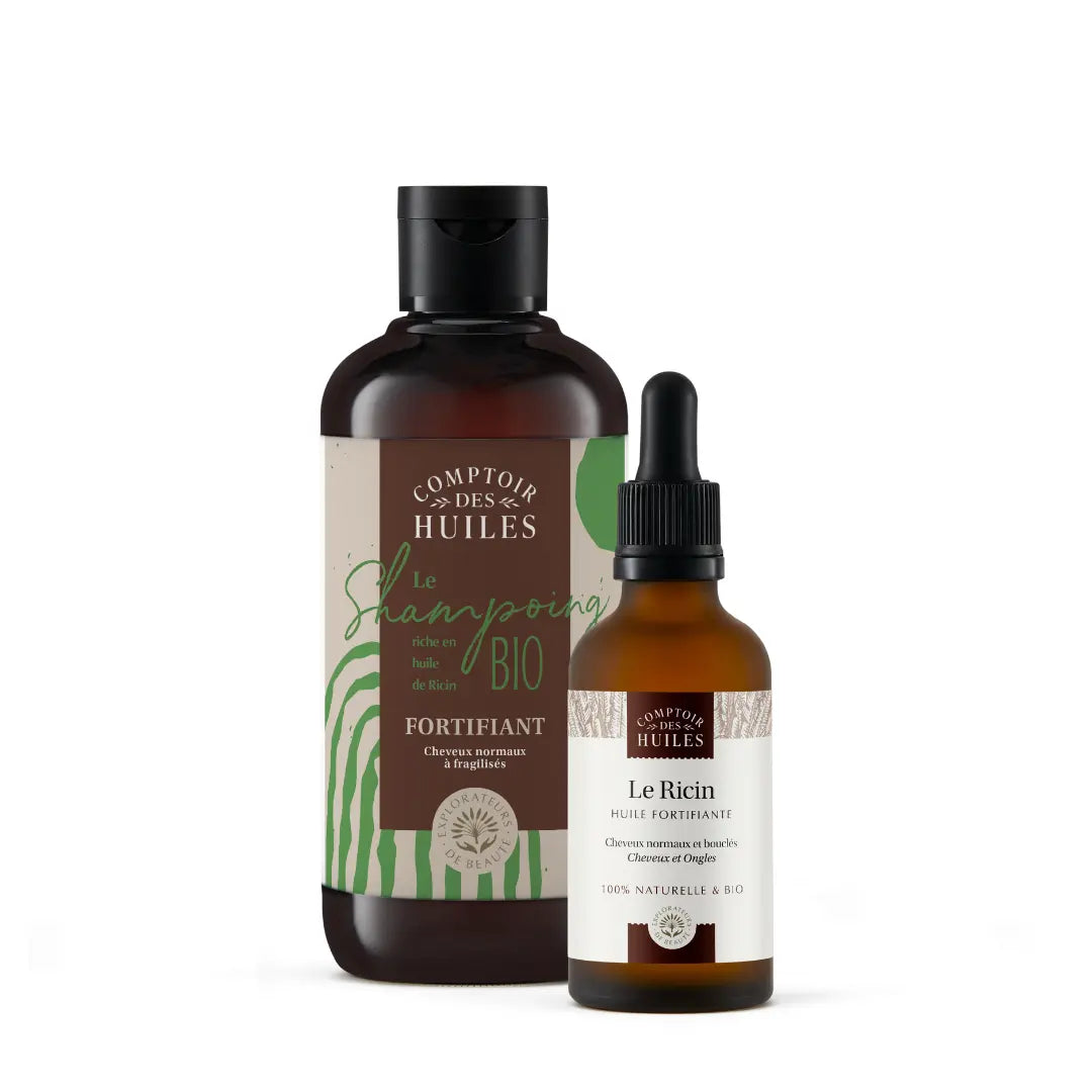 Obtenez des cheveux plus longs, plus forts et plus épais avec notre pack composé du shampoing Fortifiant et d'une huile de Ricin !